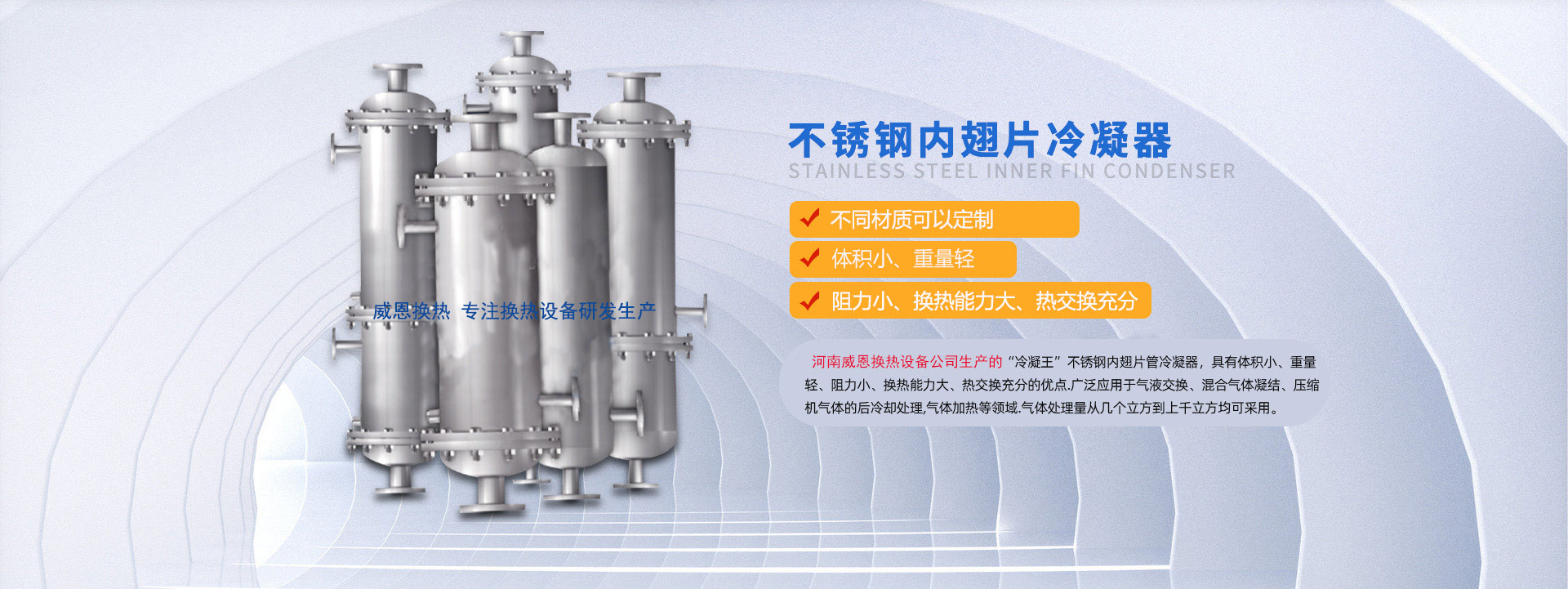 河南威恩換熱設(shè)備有限公司是一家專業(yè)生產(chǎn)制造螺旋板式換熱器、列管式換熱器、節(jié)能換熱設(shè)備的廠家,集科研、設(shè)計、生產(chǎn)、銷售、工程安裝、調(diào)試為一體的技術(shù)型企業(yè)。公司成立以來一直致力于節(jié)能環(huán)保換熱設(shè)備的研發(fā)生產(chǎn),主要產(chǎn)品包括螺旋板換熱器、列管式換熱器、內(nèi)翅片冷凝器以及鋼制儲罐、反應(yīng)釜等的研發(fā)設(shè)計與銷售。公司研發(fā)生產(chǎn)的螺旋板式換熱器,傳熱效率高、可靠性高、阻力小、不易堵塞、可有效回收低品位熱能,已經(jīng)廣泛應(yīng)用到化學(xué)、石油、溶劑、醫(yī)藥、食品、輕工、紡織、冶金、軋鋼、焦化等行業(yè),取得了良好的效果,得到顧客的廣泛認可和一致好評。針對制藥行業(yè),本公司生產(chǎn)的新型不銹鋼內(nèi)翅片換熱... 【了解更多】